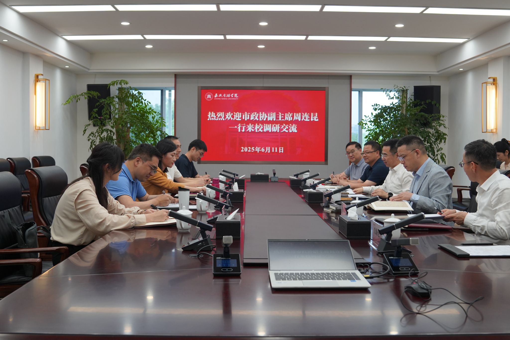 6月11日下午,嘉兴市政协副主席、民盟嘉兴市委会主委周连昆一行来校调研。校党委书记倪沪平、校长贾文胜热情接待了周连昆一行,校领导胡文蔚、庄应强参加座谈交流。